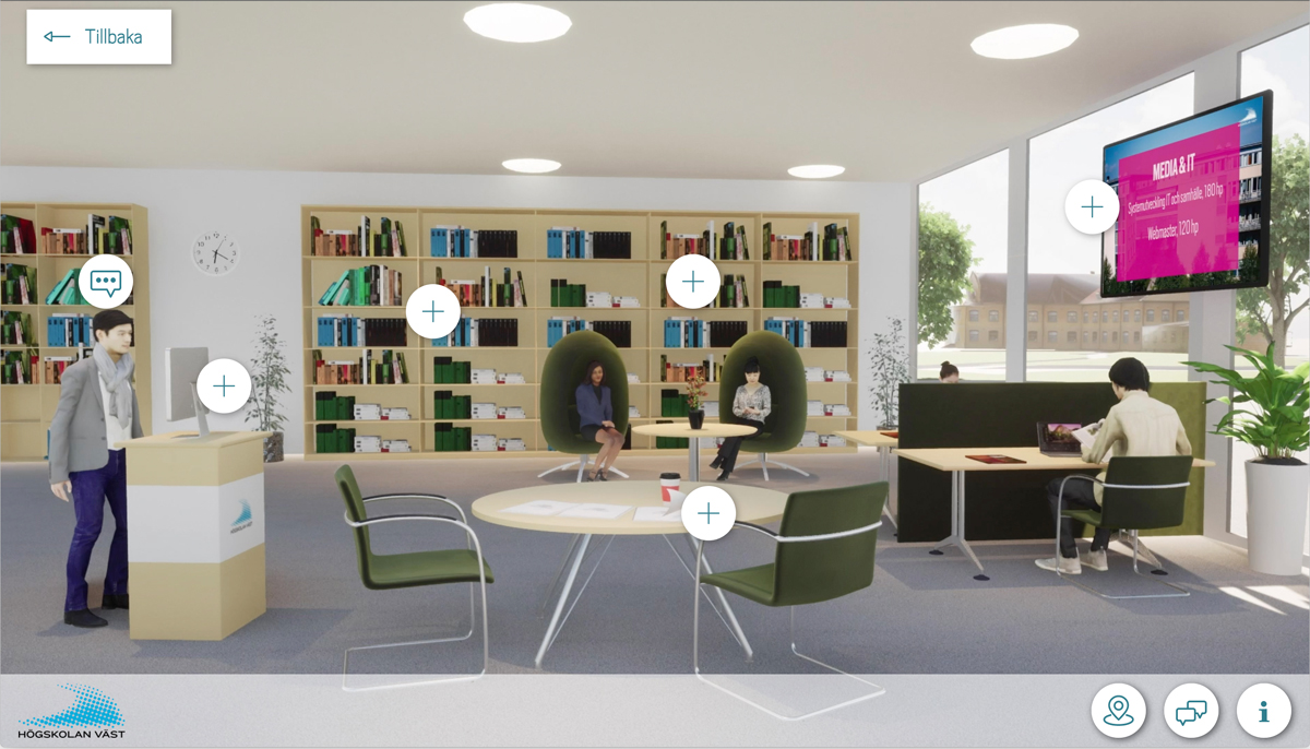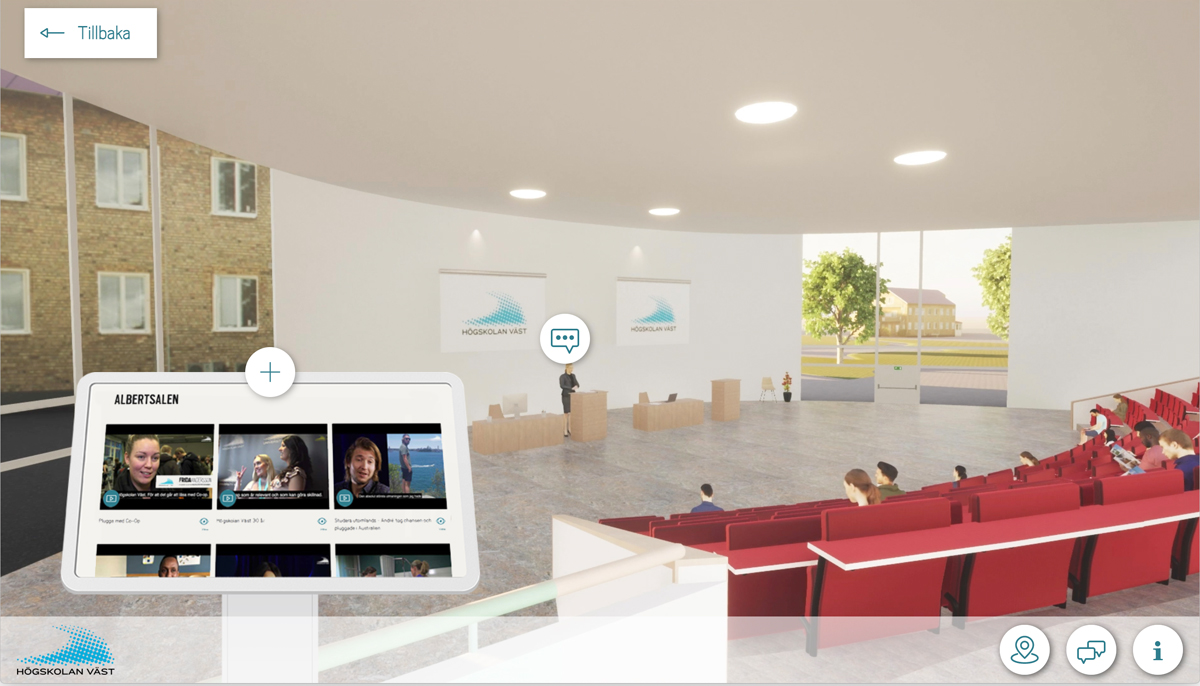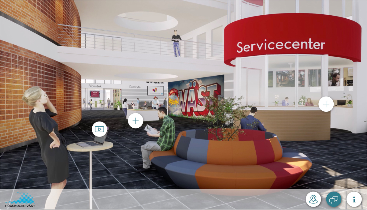 I den virtuella högskolan kan du vandra omkring och upptäcka hur det är att vara student på Högskolan Väst. På områdets Eventyta går det till exempel att virtuellt träffa några av deras studenter och du kan här även göra ett digitalt test för att se vilken utbildning som passar just dig bäst. I biblioteket har man dessutom samlat allt om högskolans olika utbildningar och i den stora föreläsningssalen Albertsalen går det att ta del av informationsfilmer om bland annat utlandsstudier.